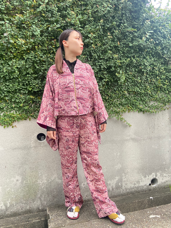 着物をリメイクしました。 古着を使用しているため、裏地部分にシミが少々ございます。 神経質の方は御遠慮ください。 前開きファスナーのトップスと、前開きチャックのストレートパンツ。 ウエスト:68センチでウエストベルトがついているので、調整可能です。 股下寸法:70センチ 丈直し承りますのでお気楽にメッセージください。 トップスとパンツで別れているので色々な着こなしができ楽しめます。カジュアルにも、ガーリーにも、メンズファッションにも取り入れることが出来ると思います。 |